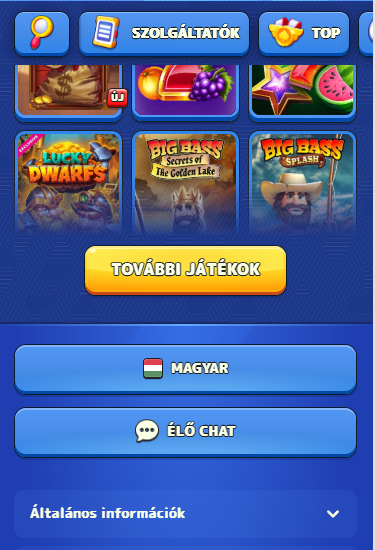 A lobby naponta frissülő nyerőgépekkel, jackpotokkal és „Bonus Buy” címekkel vár. Az élő kaszinóban rulett, blackjack, baccarat és game show-k futnak elismert stúdióktól.